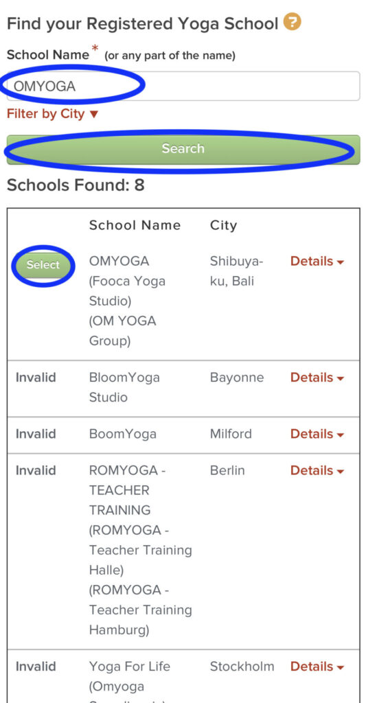 緑のSearchをクリックします。出てきたスクールの名前で自分のスクールを選択し、緑のSelectをクリックします。