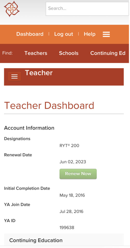 登録が完了すると、1年間、認定講師として登録されます。認定期間中に使用が可能である、RYT500の公式ライセンスカード・ロゴの取得を行なっていきます。トップページよりログインし、「Basic Dashboard(ダッシュボード)」から「Teacher」⇒「Teacher Dashboard」をクリックしてください。
